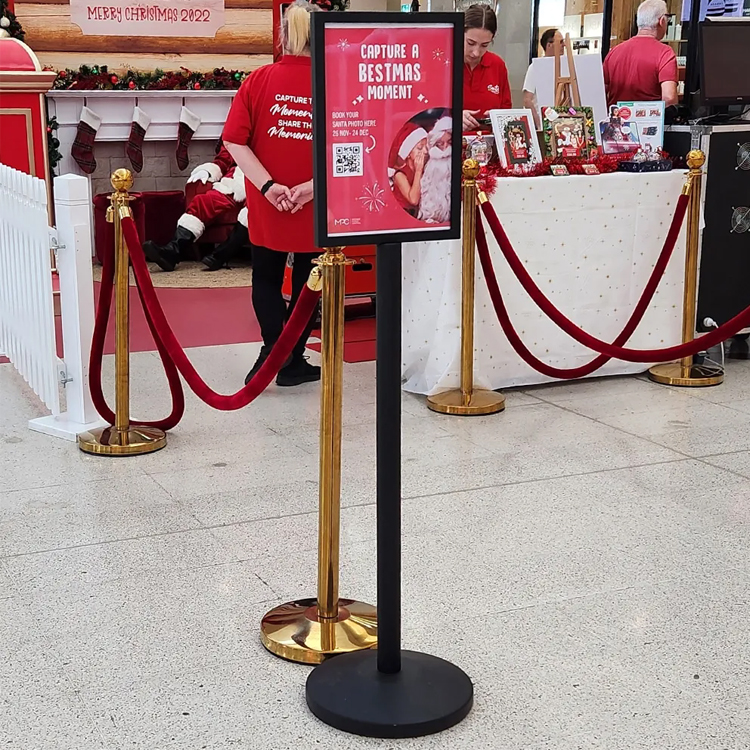 Portrait Orientation Advertising Display Sign Stands for Bollard Posts fits A5, A4, A3, A2, or A1 custom signage, offering an easy-to-update solution for menus, notices, promotions, or event messaging. perfect for crowd control guidance, retail sales, corporate displays, and restaurant menus, with multiple paper sizes available to suit different settings. Note: This product is intended for indoor use only.