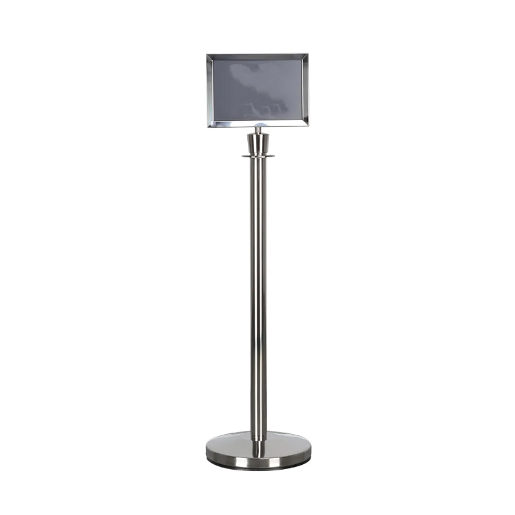 The 8.5×11 portrait orientation poster holders offer a sleek, professional, and easy-to-update solution for menus, notices, or promotions. This heavy-duty metal frame, crafted from steel, 201SS, 304SS, easily attaches to stanchion posts with post adapters, making it simple to display custom signage for passing visitors. Two acrylic panels keep the A4 paper upright and protected. Note: This product is intended for indoor use only.